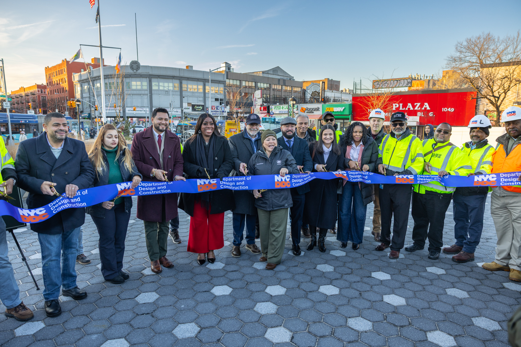 The City of New York has completed a $12 million reconstruction of Monsignor Raul Del Valle Square in Hunts Point, The Bronx. The project was a joint effort by NYC Parks, the Department of Design and Construction (DDC), and the Department of Transportation (DOT). Managed by DDC, the initiative transformed the high-traffic plaza into a safer, more accessible public space and was completed on time and nearly 20 percent under its $14.8 million allocated budget. The square is located at the intersection of Bruckner Boulevard, East 163rd Street, and Hunts Point Avenue.