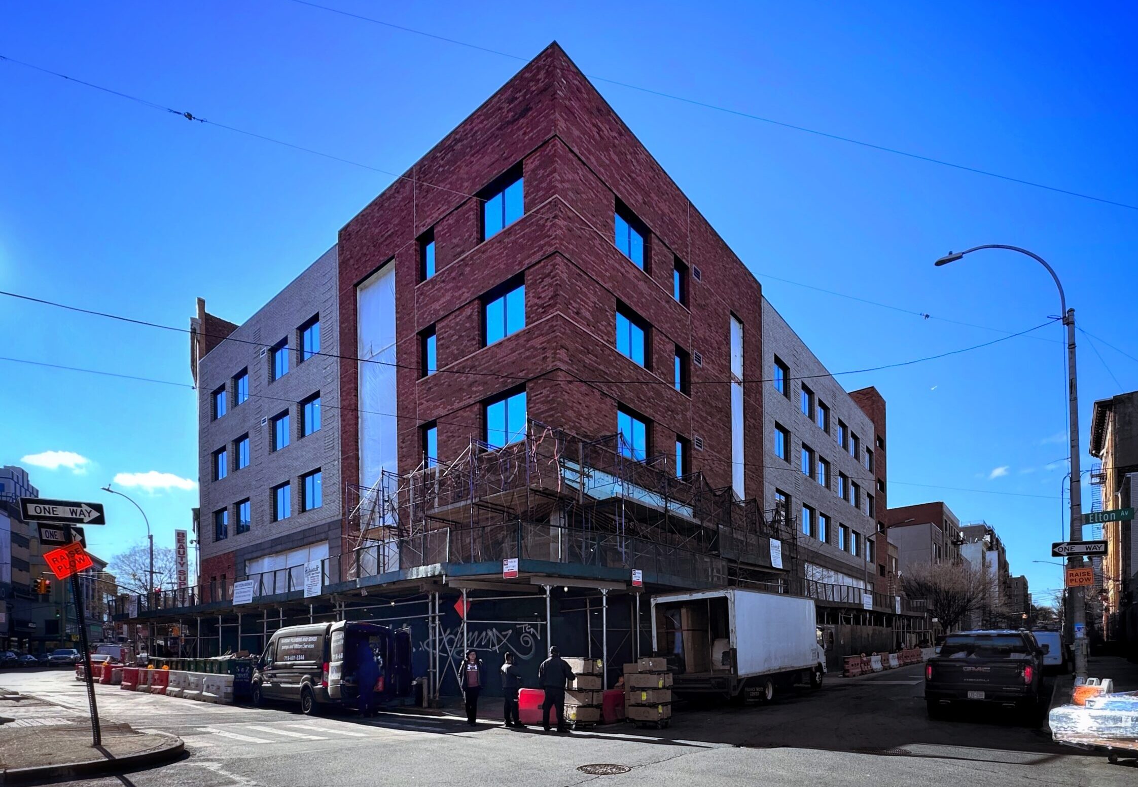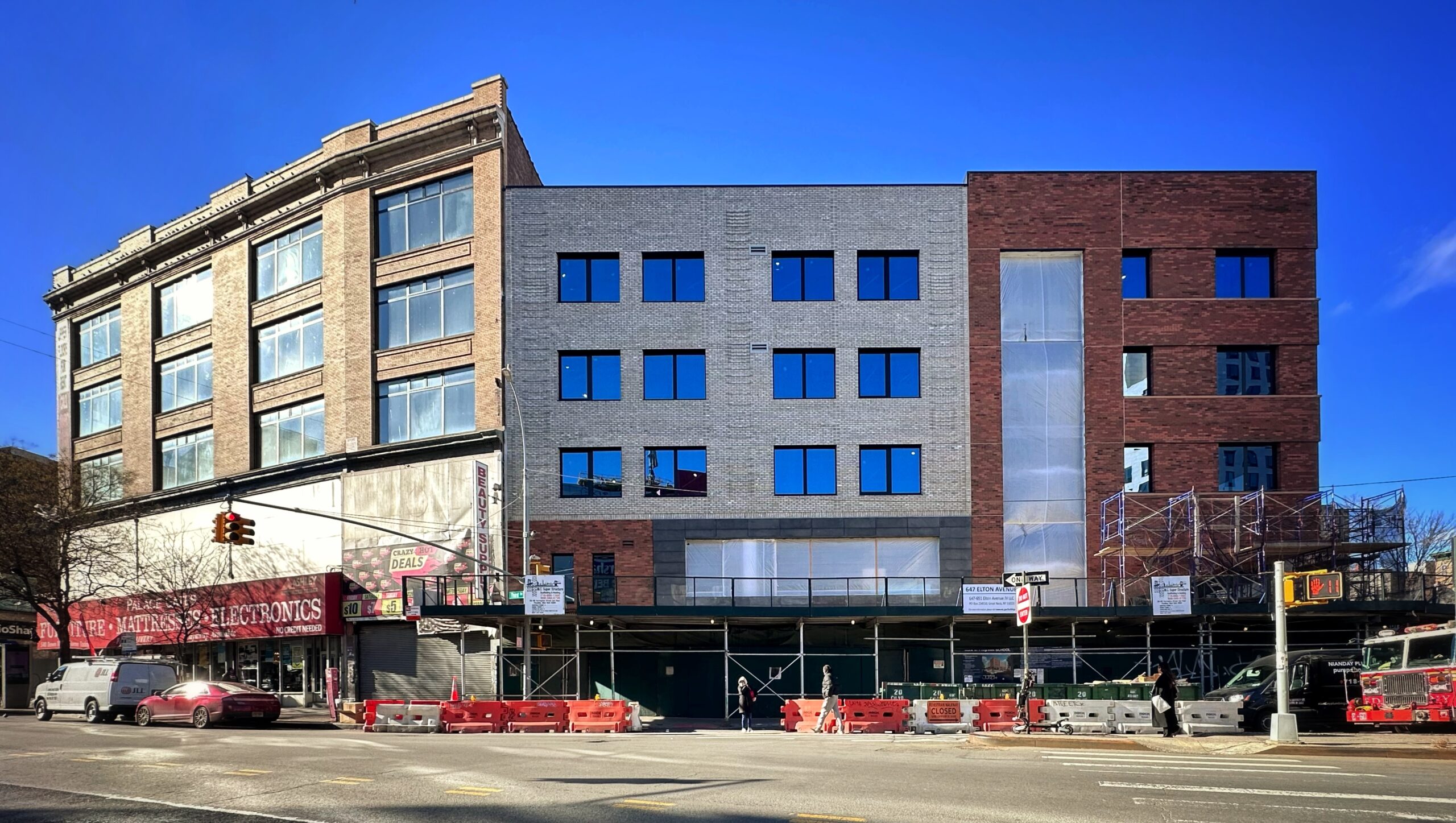 Construction broke ground in October 2024, and the structure now stands almost fully enclosed in its façade of red and gray brick surrounding a grid of recessed windows. Work is still finishing up on the ground floor, which remains obscured by the sidewalk shed.