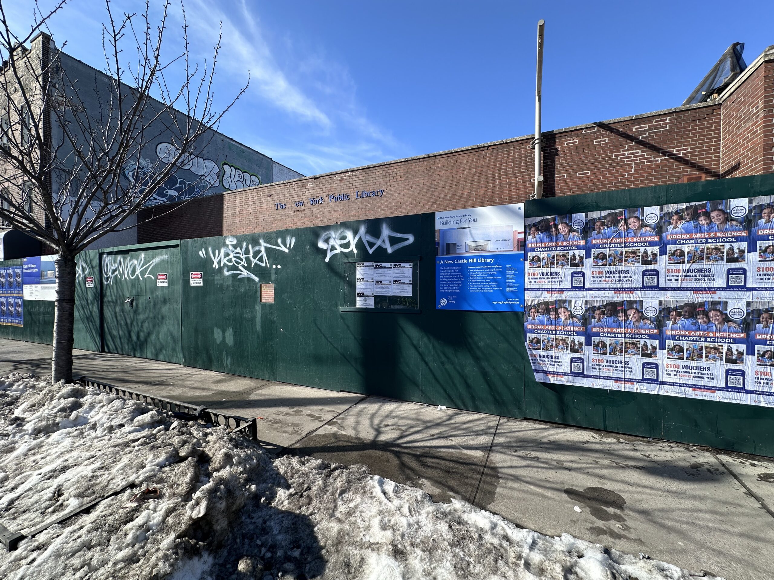 Work is underway on the modernization of the Castle Hill Library, a one-story building at 947 Castle Hill Avenue in Castle Hill, The Bronx. Designed by Abruzzo Bodziak Architects LLC and managed by the NYC Department of Design and Construction, the $17 million project will overhaul the structure’s interiors and replace its red brick façade with a modern envelope. The property is located by the corner of Bruckner Boulevard and Castle Hill Avenue.